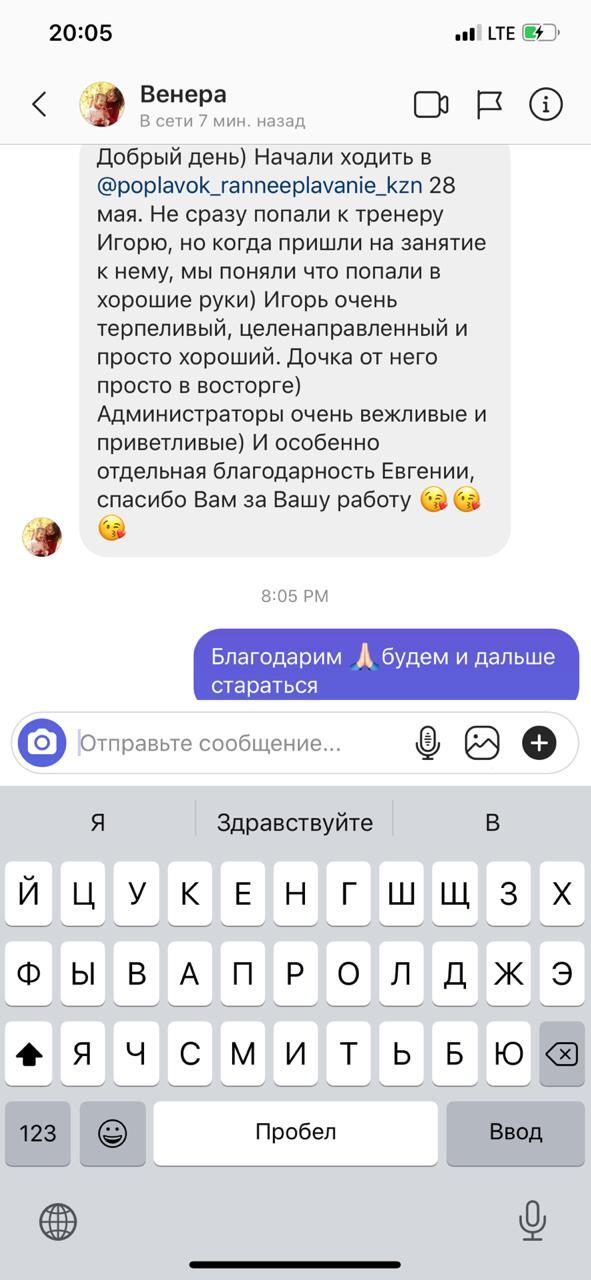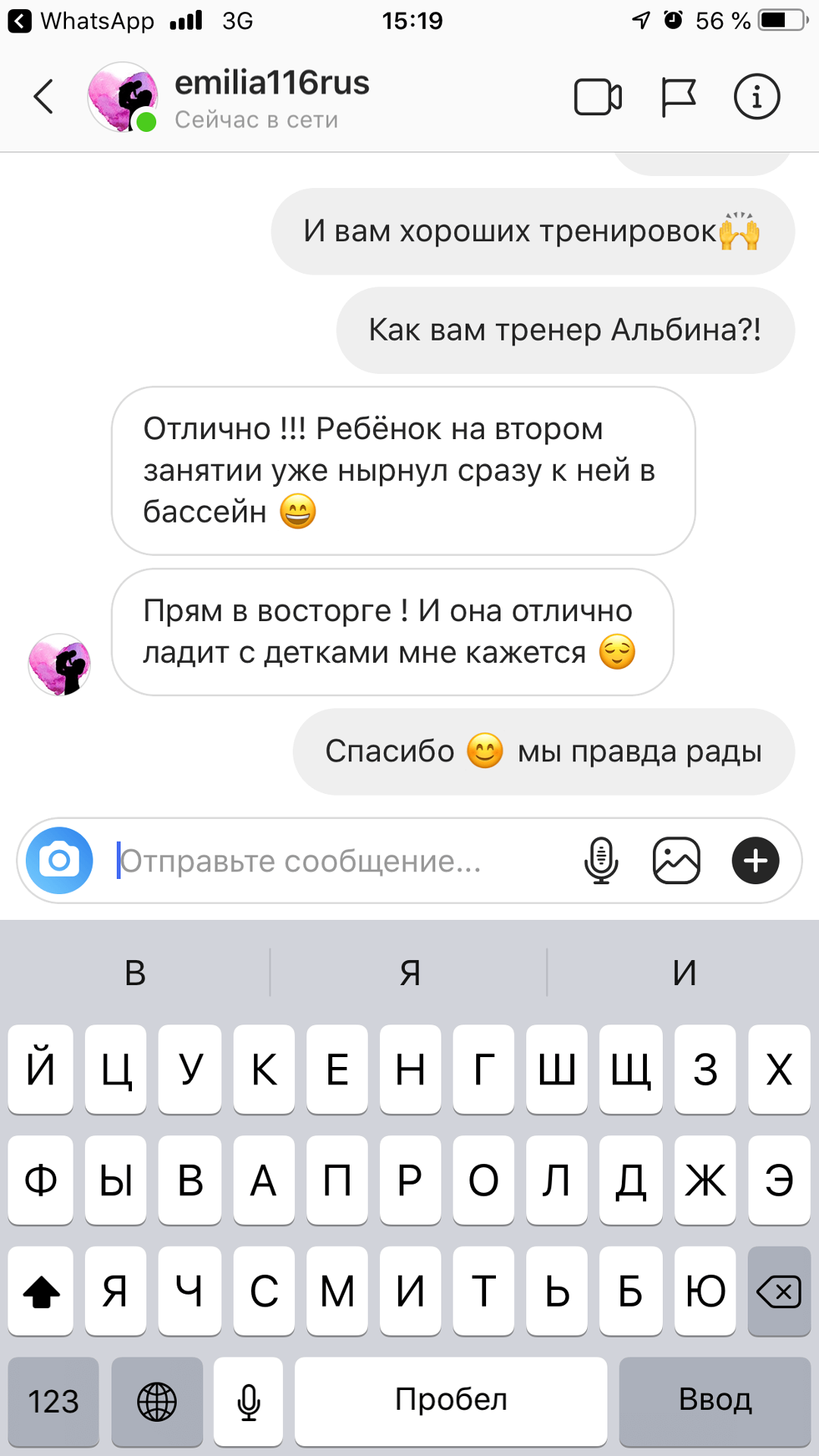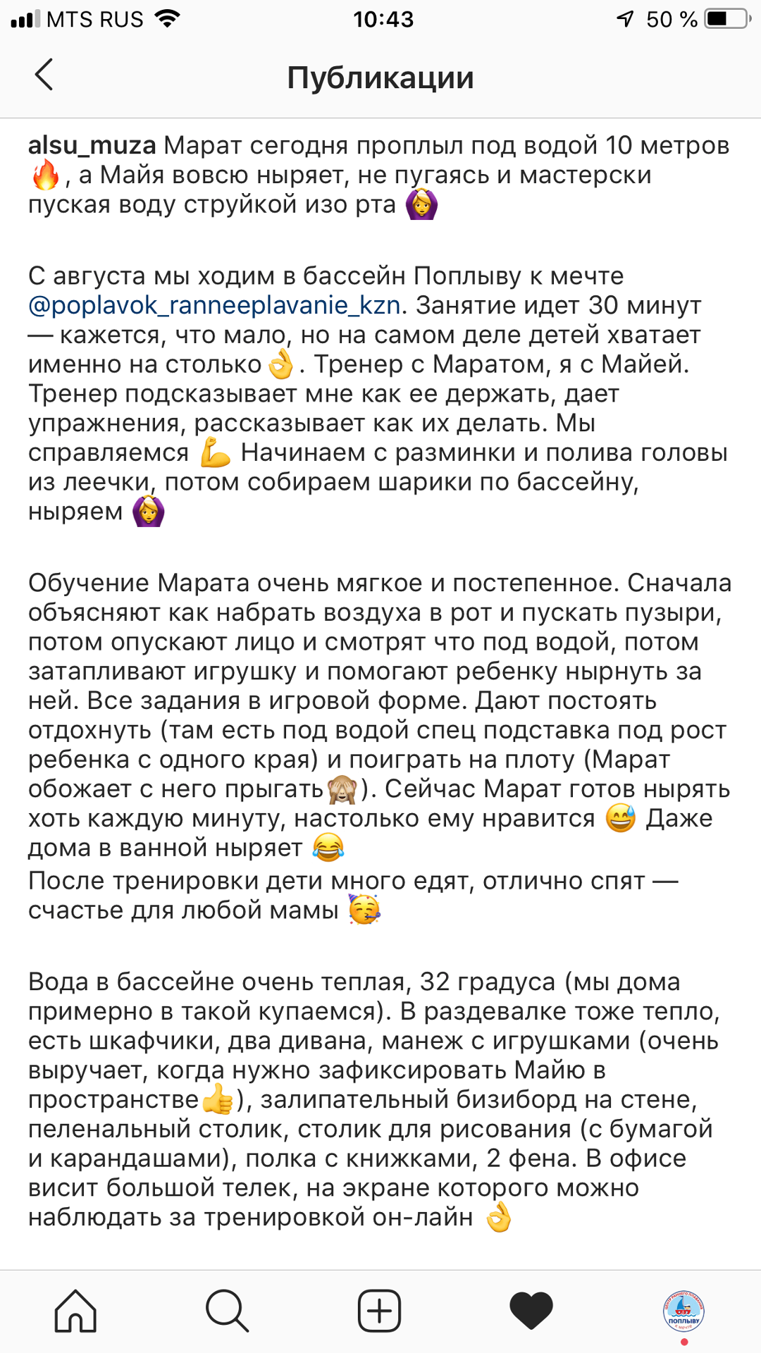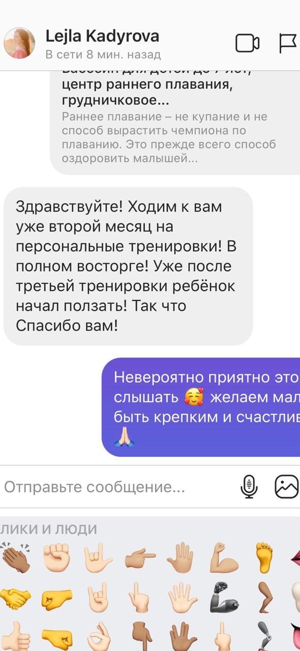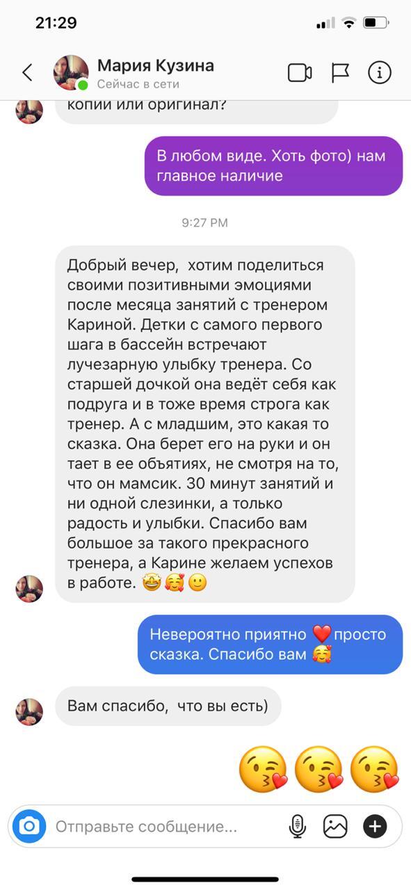 Я обожаю работать с детьми и хорошо понимаю их потребности — ведь я сама мама. Для меня важно, чтобы малыши чувствовали себя в воде комфортно, безопасно и с радостью осваивали новые навыки.